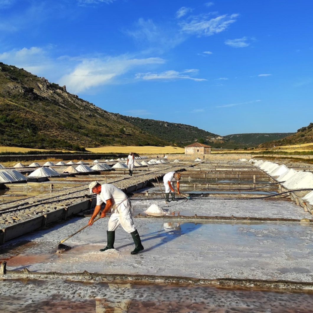 At the Salinas de San Juan, located in Saelices de la Sal, artisanal production of fleur de sel, a high-quality variety of salt known as “the queen of salts” for its fine and crunchy texture, takes place. This product is collected by hand from the surface of the water, which limits its production and makes its collection a complicated process.